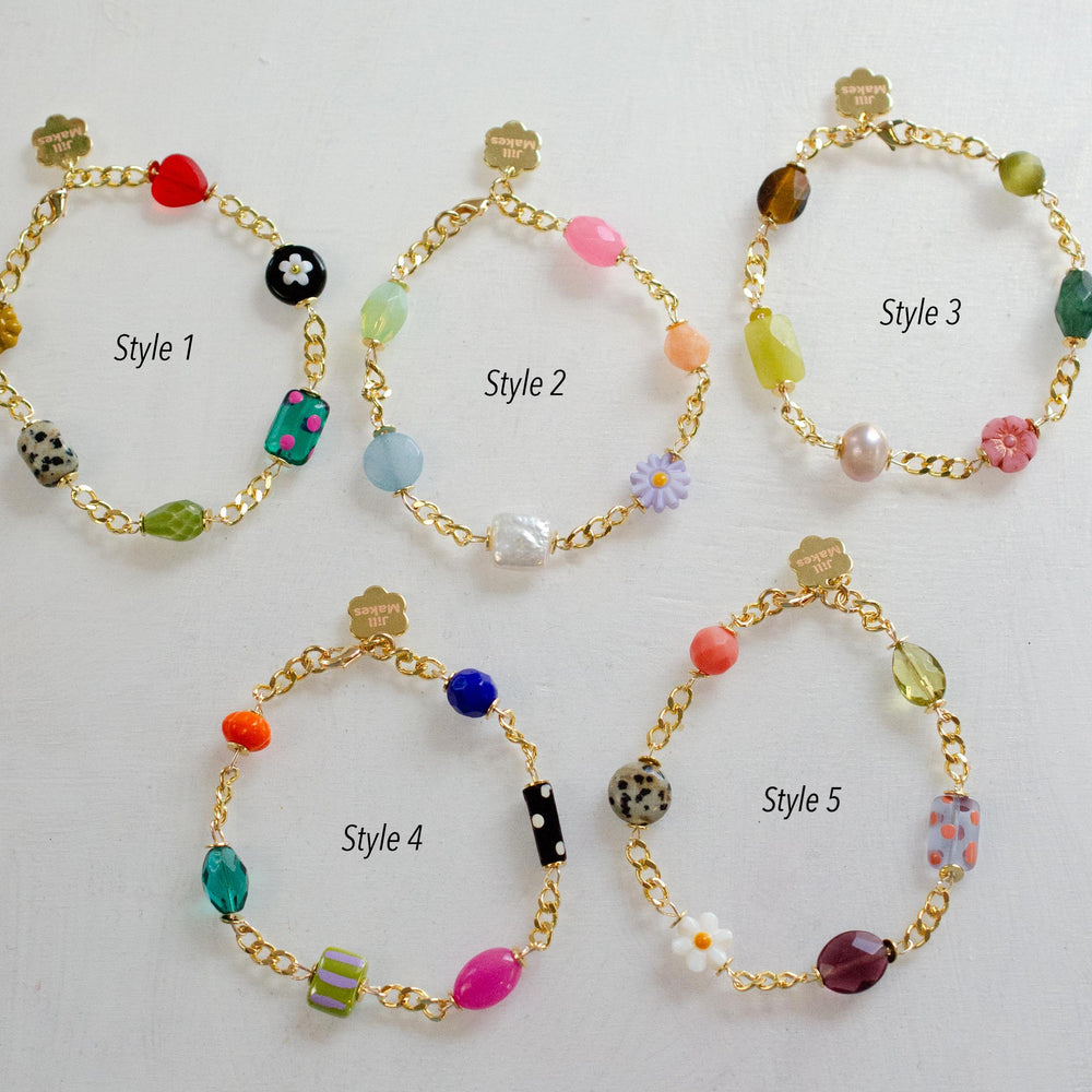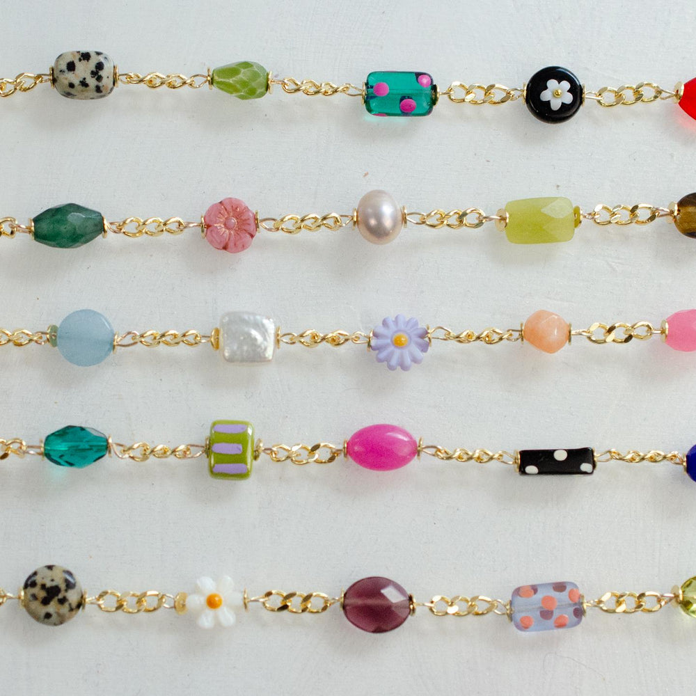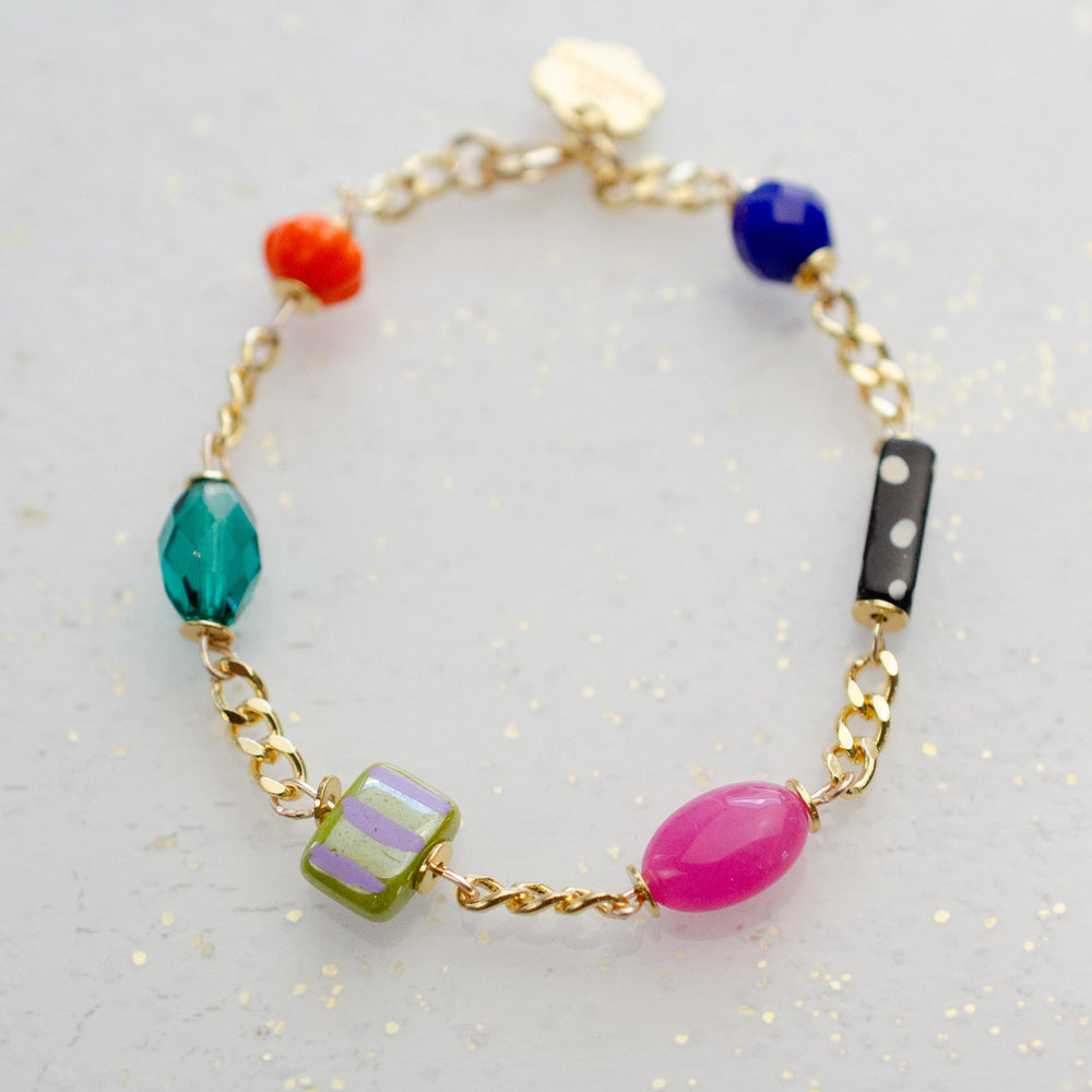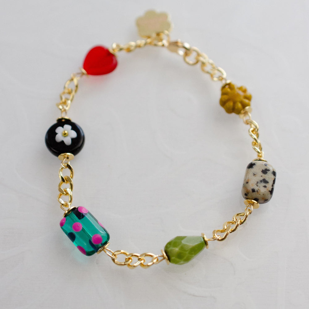 This handmade charm bracelet features a vibrant mix of dainty charms made from glass, Czech, Mother of Pearl, and gemstone beads. Each charm is attached to a gold curb-style chain.