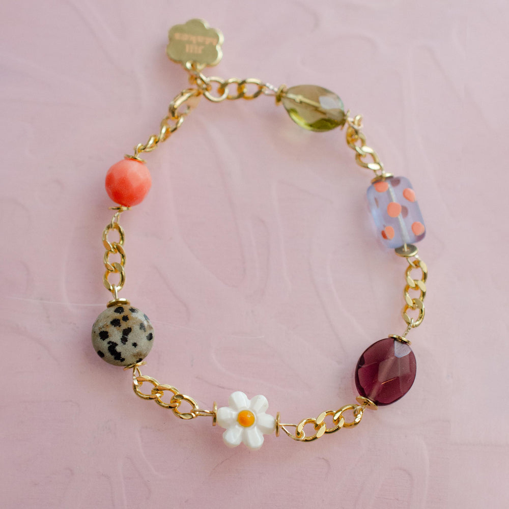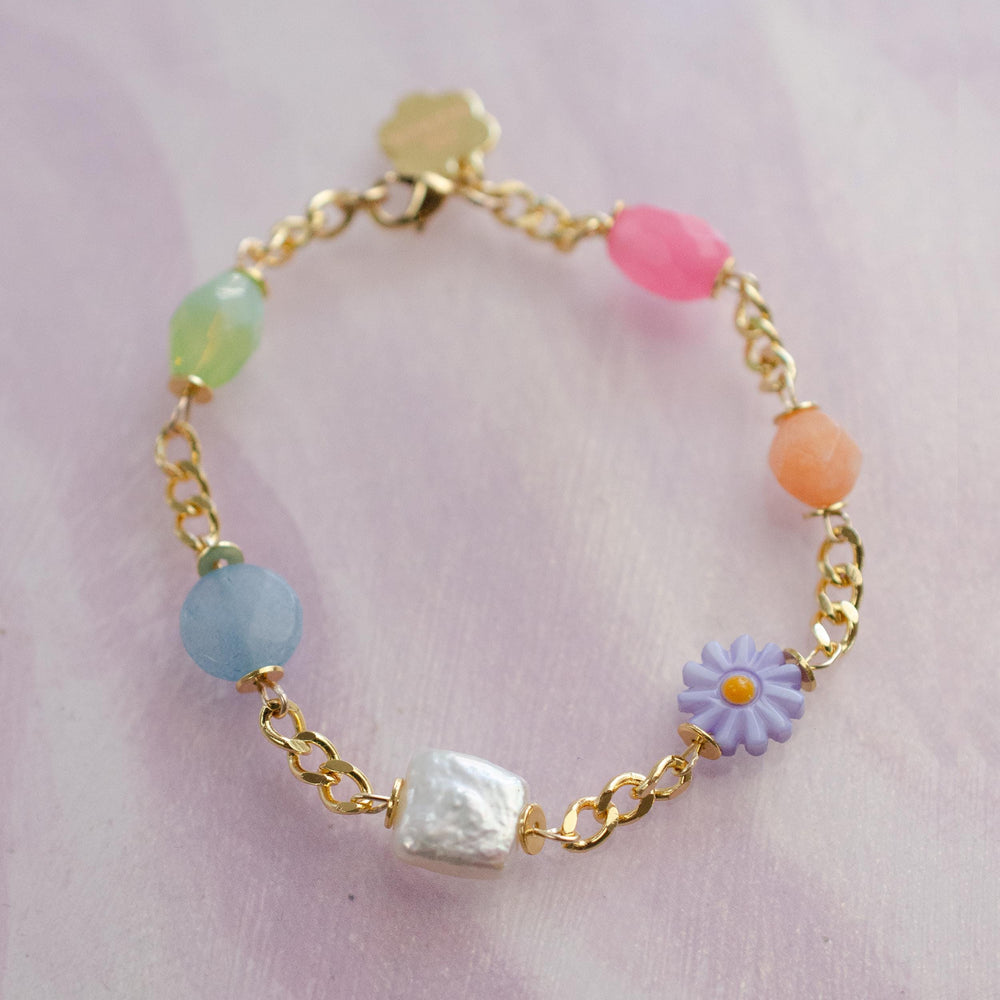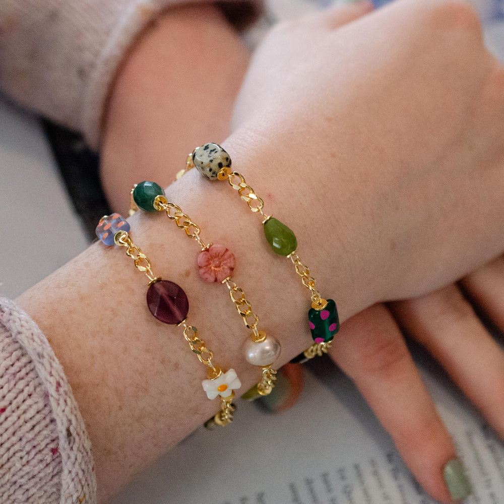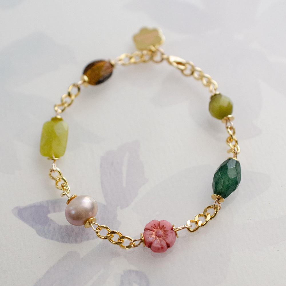 This handmade charm bracelet features a vibrant mix of dainty charms made from glass, Czech, Mother of Pearl, and gemstone beads. Each charm is attached to a gold curb-style chain.
