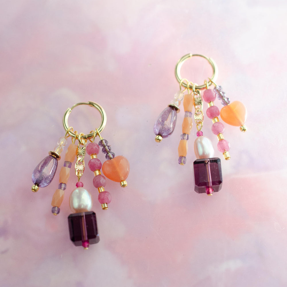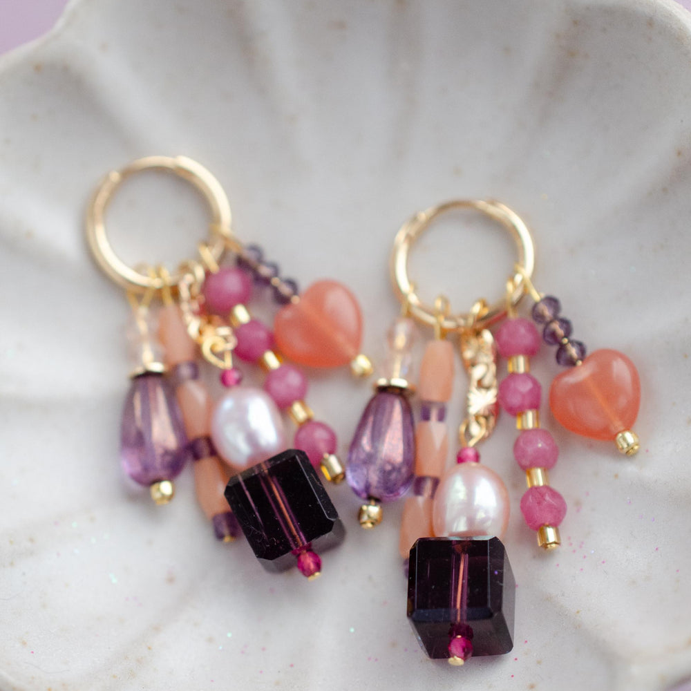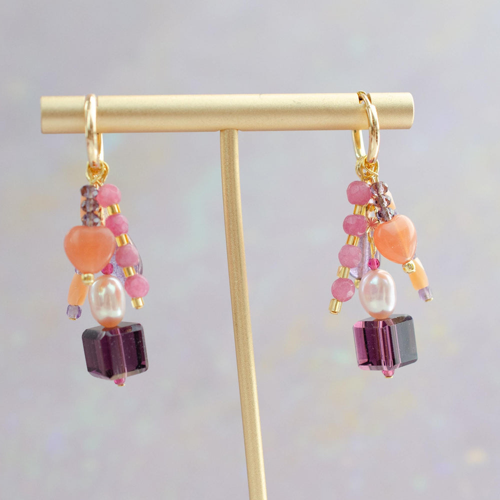 Handmade dangle earrings featuring a coloful mix of Czech glass beads, a heart accent, and a freshwater pearl. Designed to be lightweight and easy to wear.