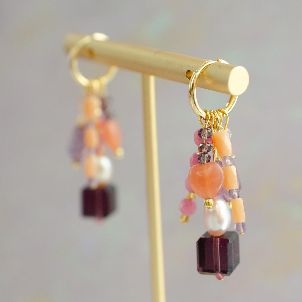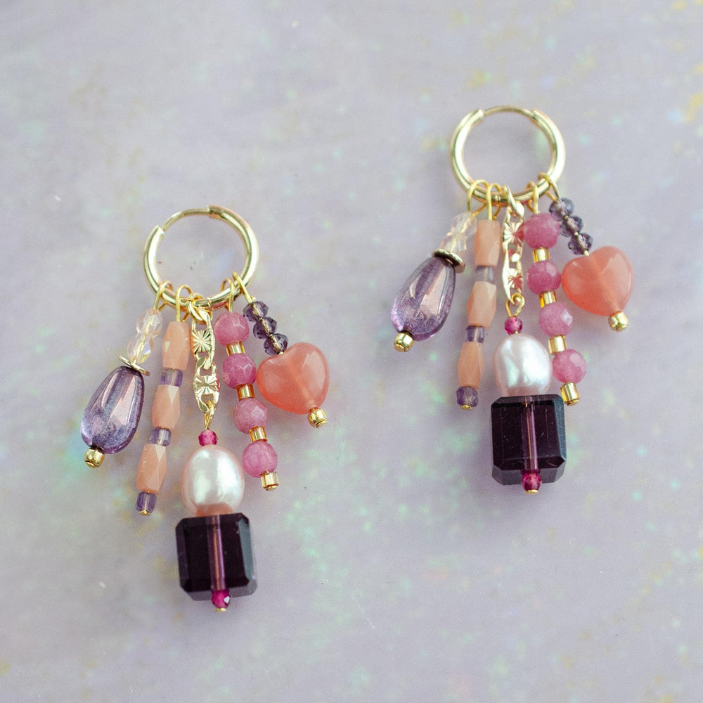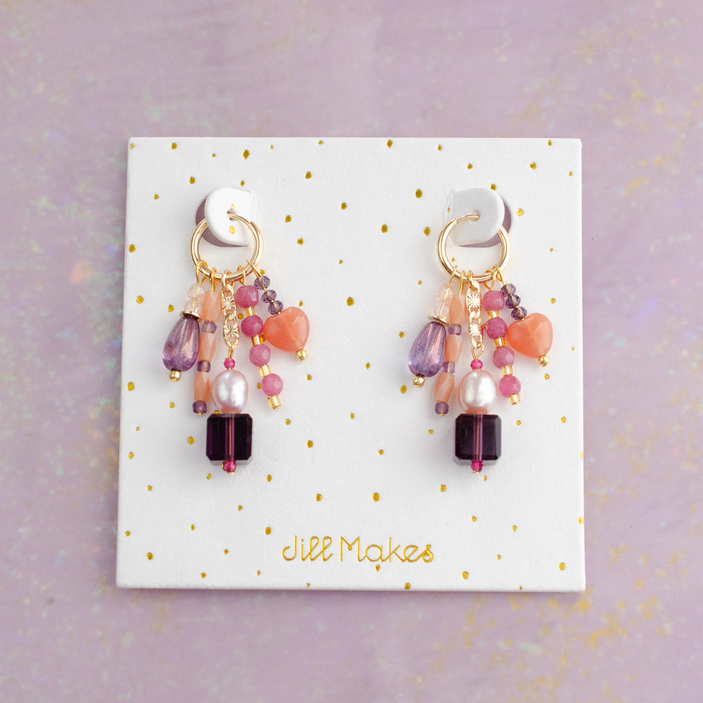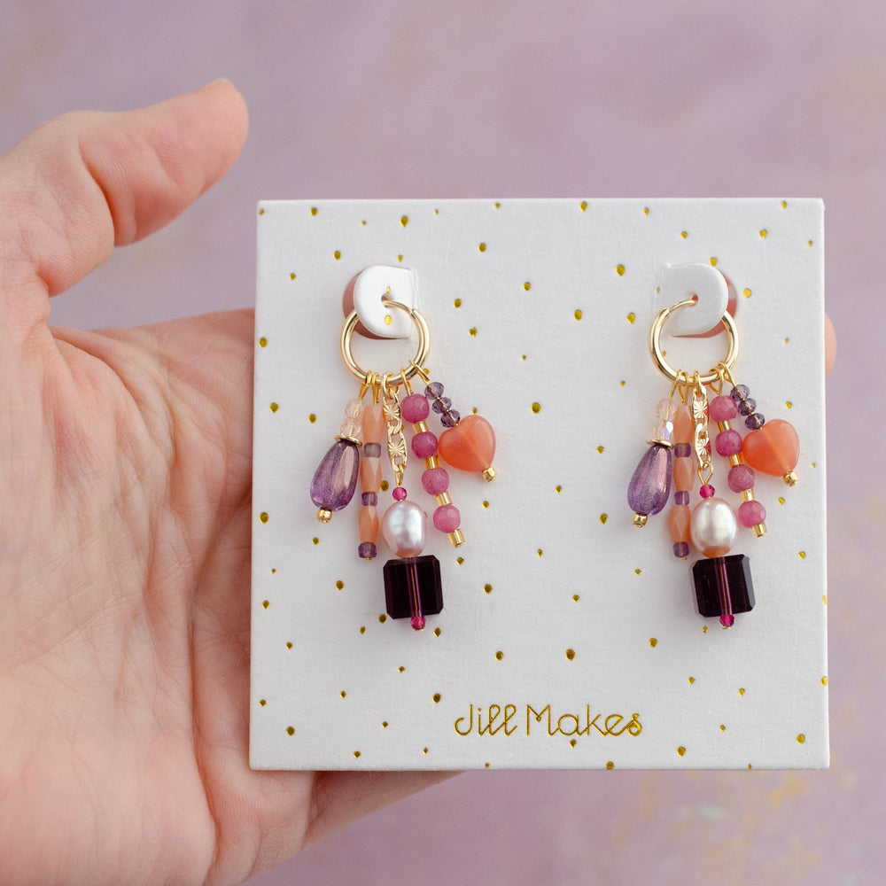 Handmade dangle earrings featuring a coloful mix of Czech glass beads, a heart accent, and a freshwater pearl. Designed to be lightweight and easy to wear.