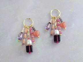 A mix of pinks, peach, lavender, pearl white, and deep plum, finished with warm gold tones.