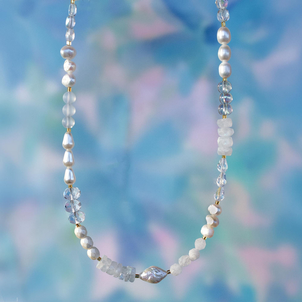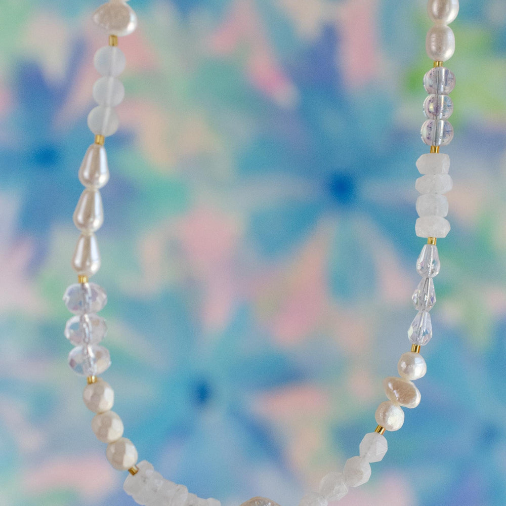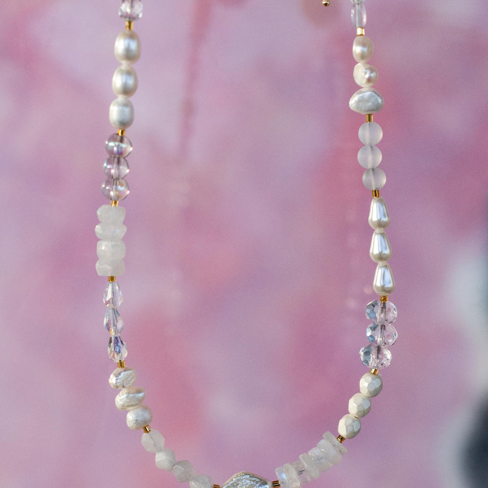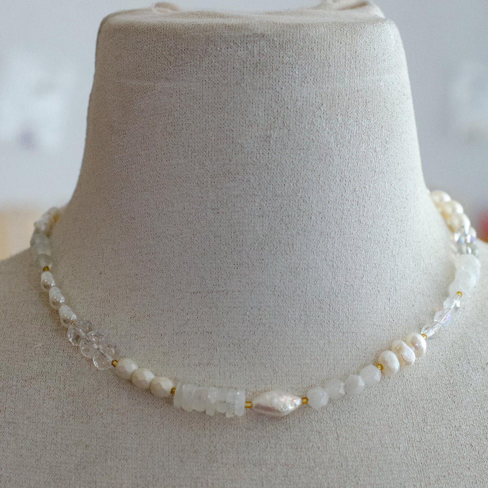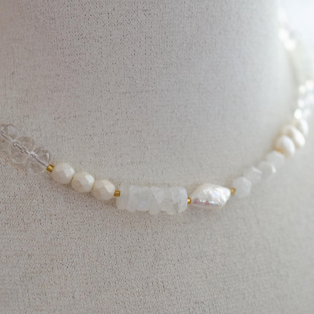 This handmade necklace is designed with a soft mix of white beads, including moonstone, freshwater pearls, Czech glass, and crystal accents. The combination gives the necklace a subtle shimmer and a natural iridescent finish.