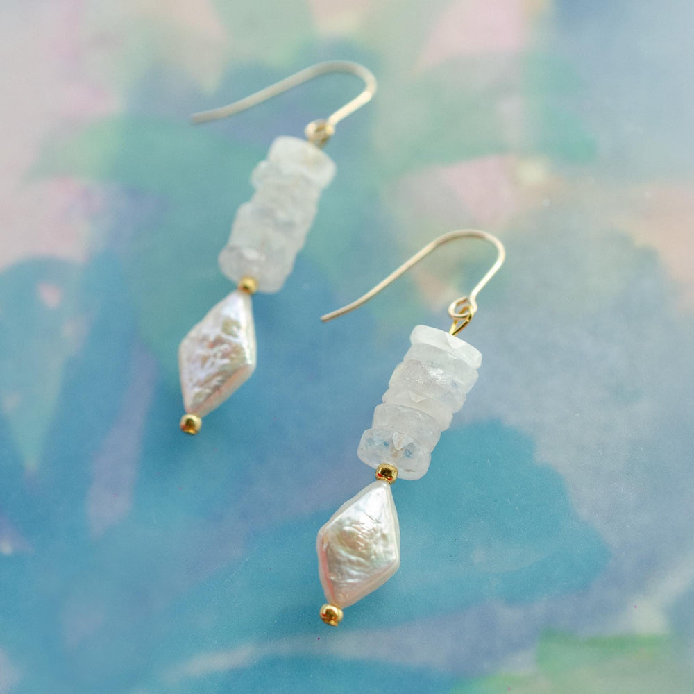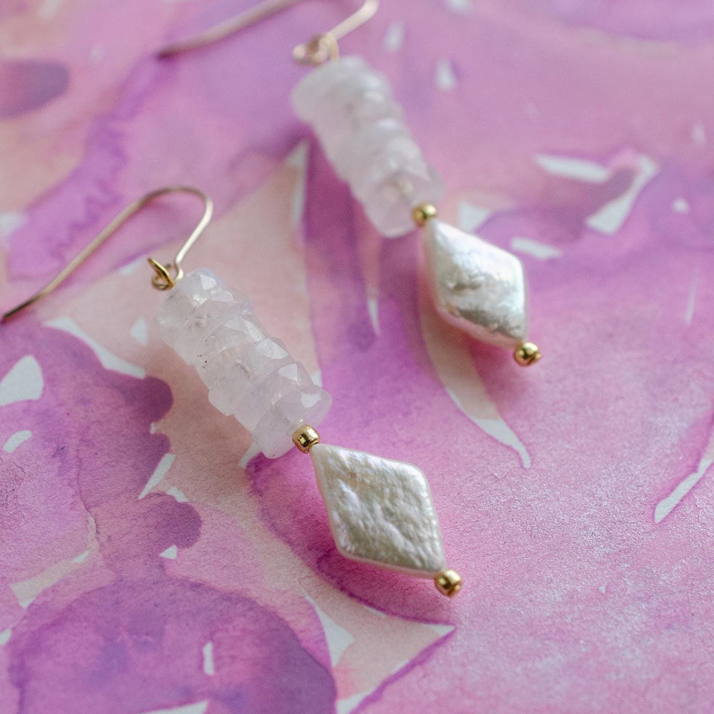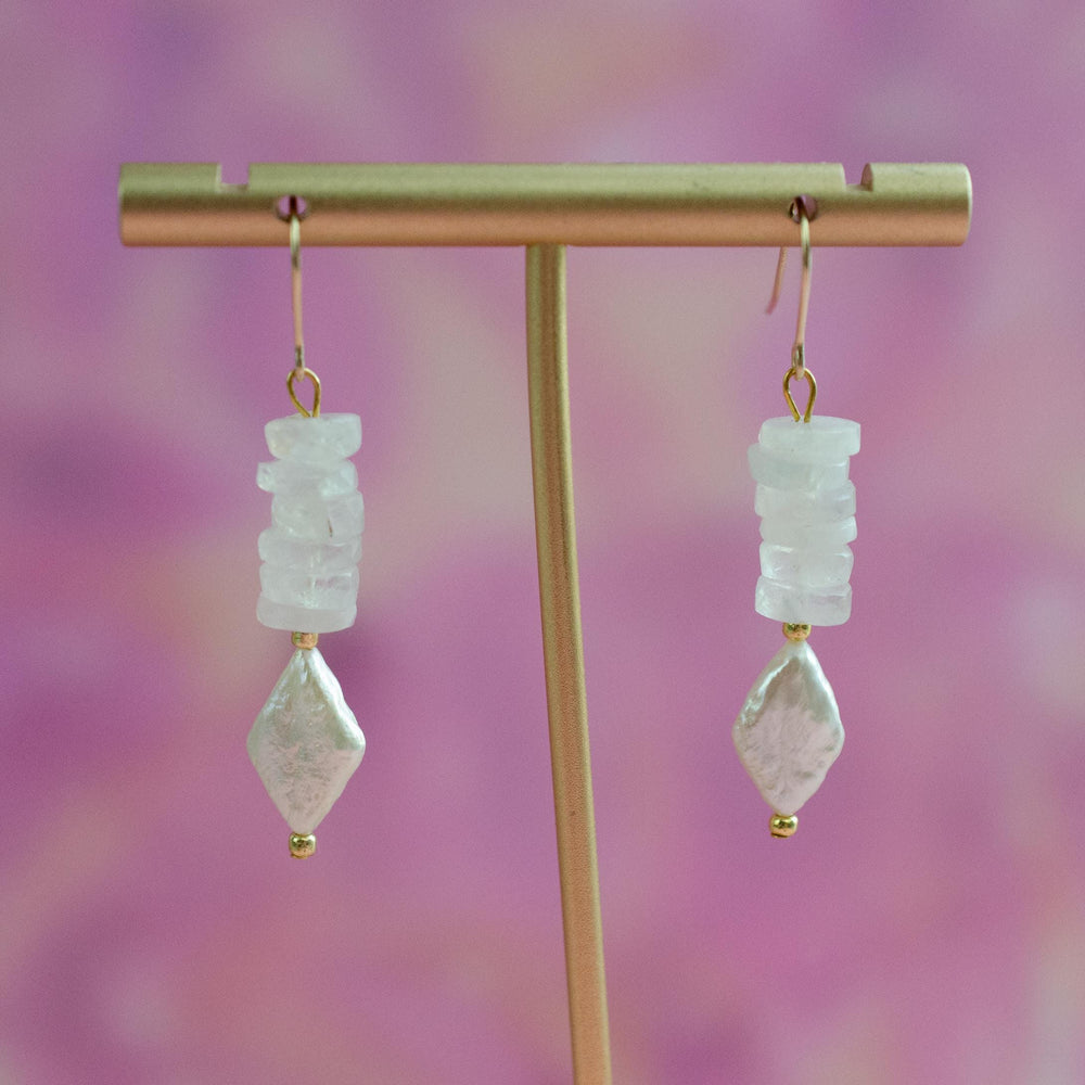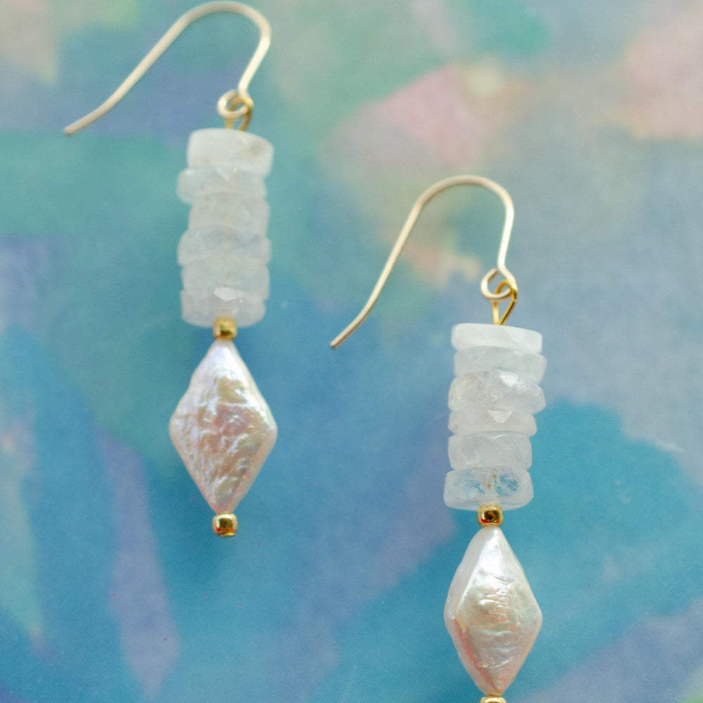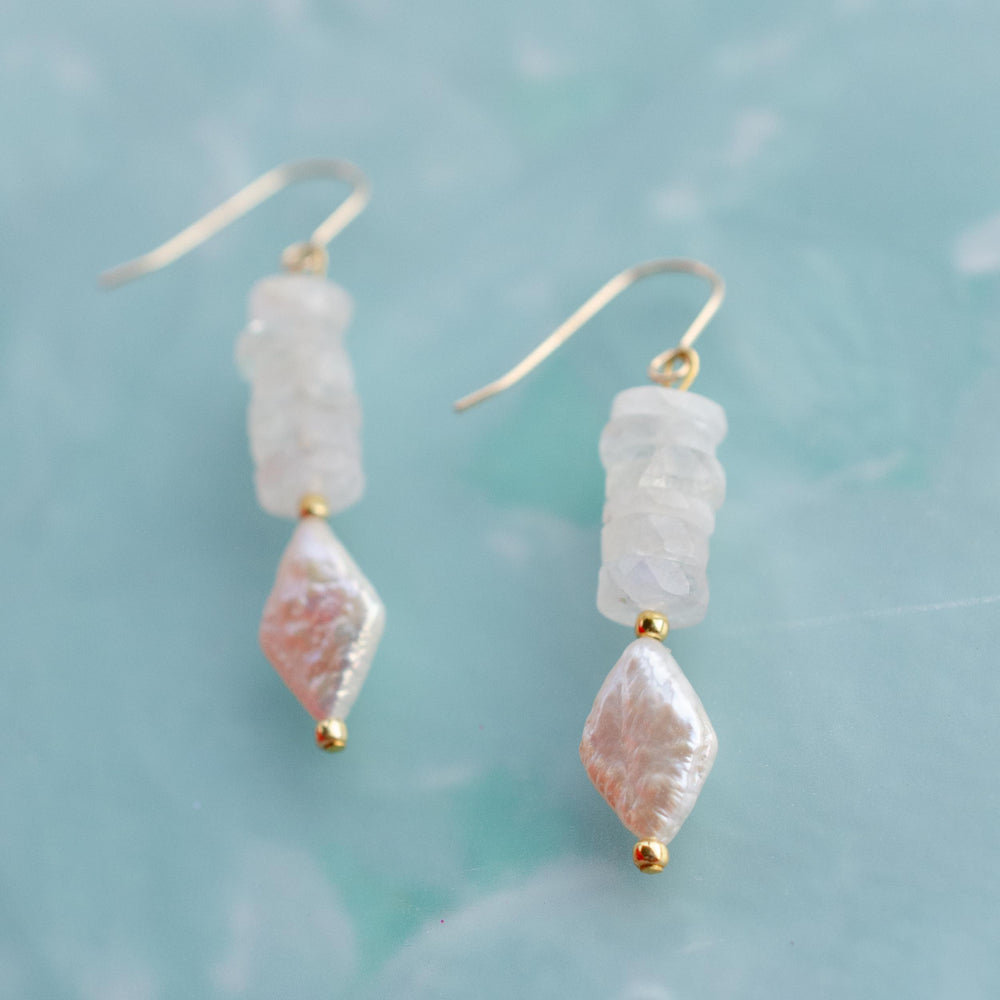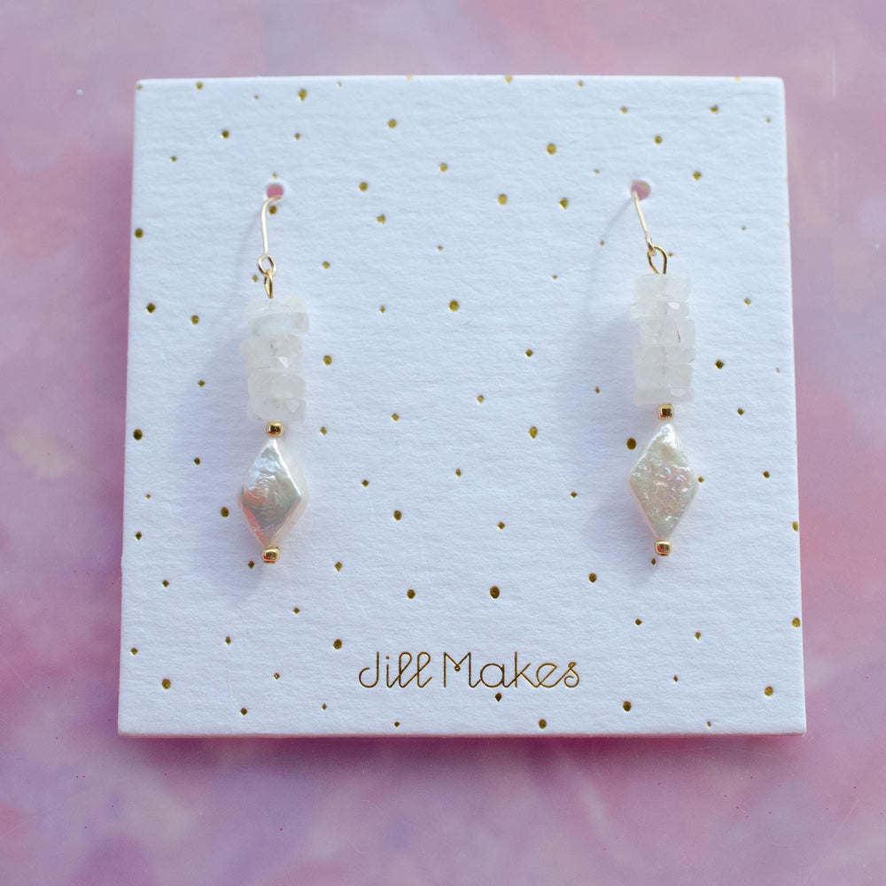 These drop earrings are made with natural moonstone rondelle beads and a faceted mother of pearl diamond bead. The neutral tones make them easy to wear every day, while still feeling elevated enough for special occasions.