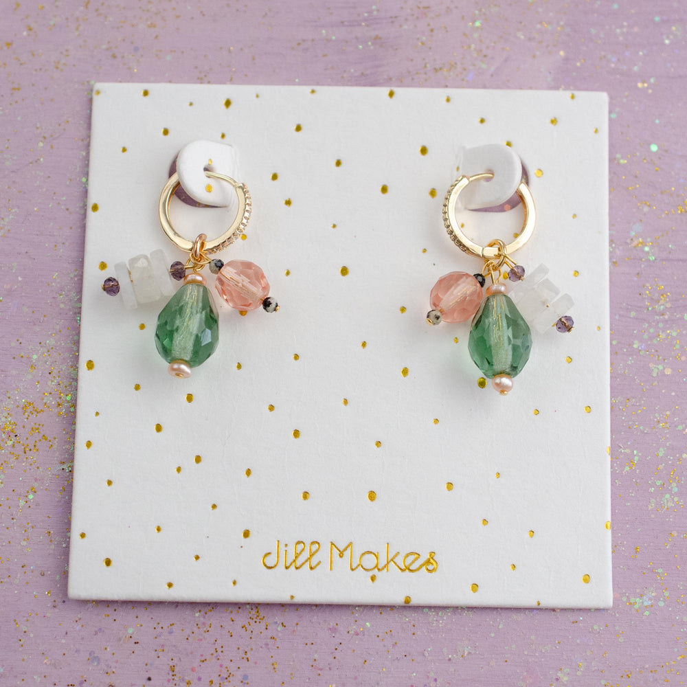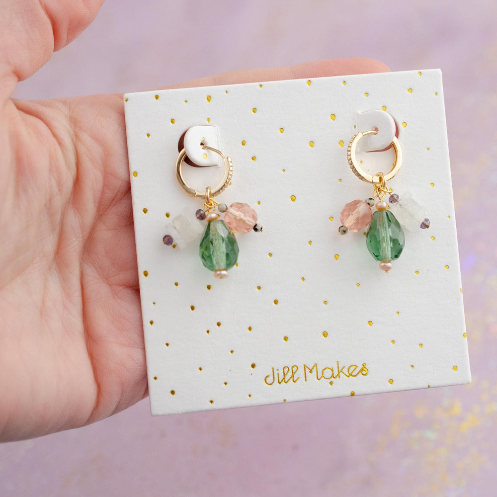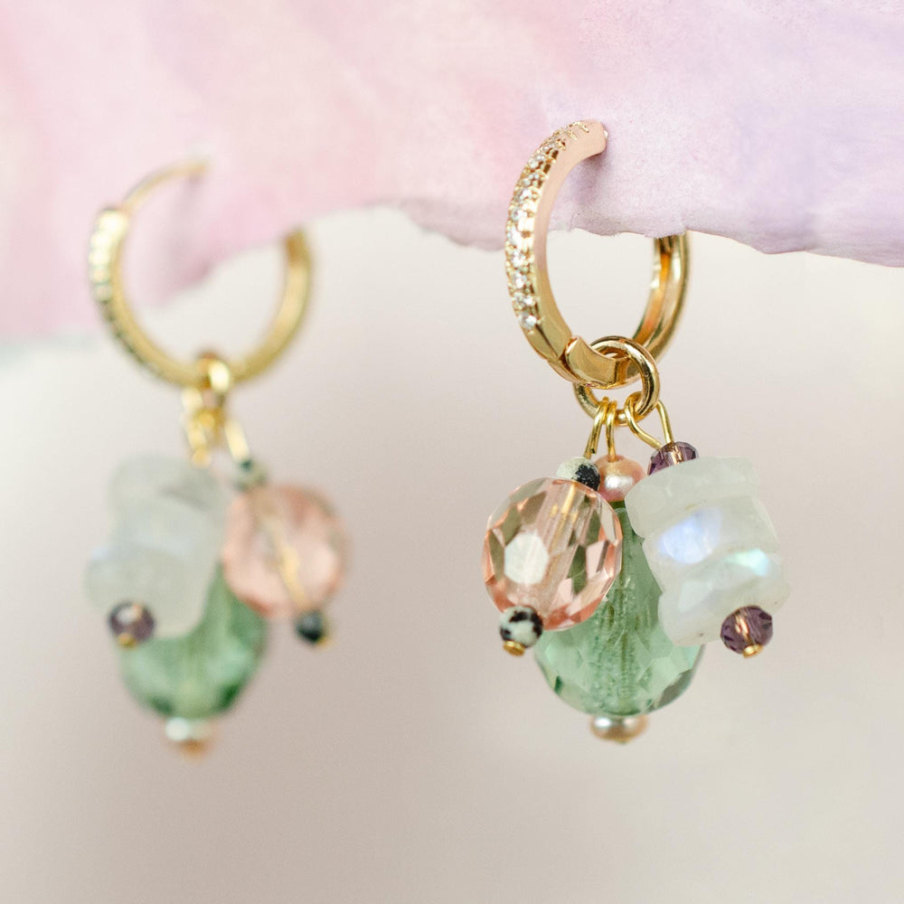 Handmade charm earrings featuring 14mm rhinestone beaded hoops with a mix of Czech glass and gemstone beads. Finished with a Czech tourmaline green teardrop bead, pink Czech glass, and moonstone accents.