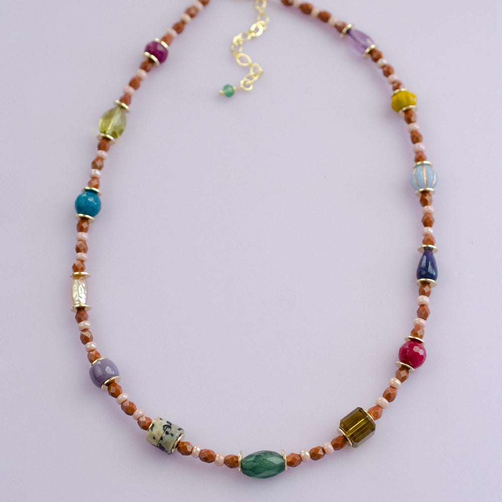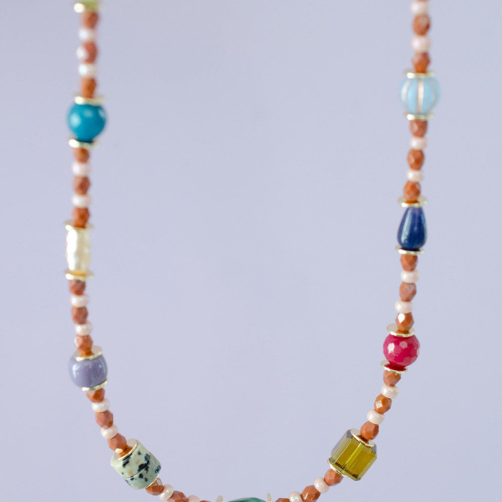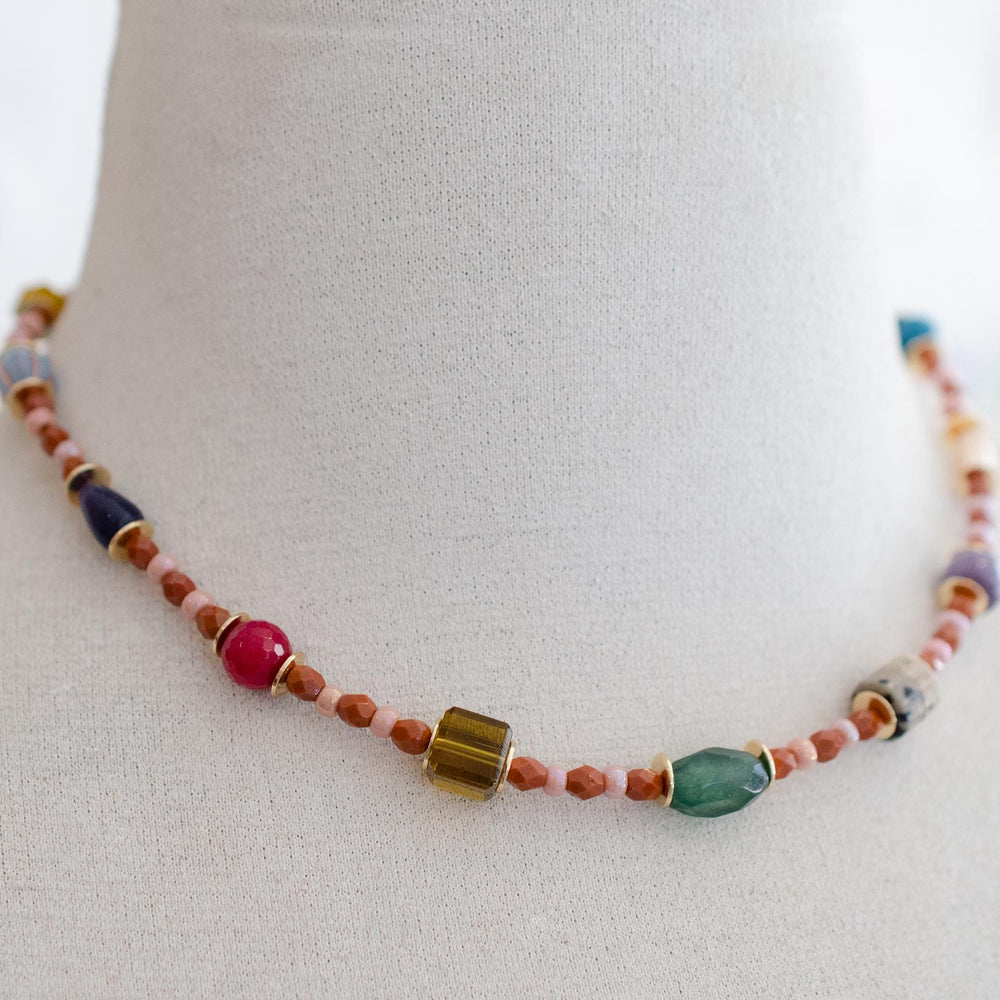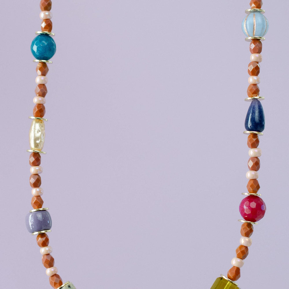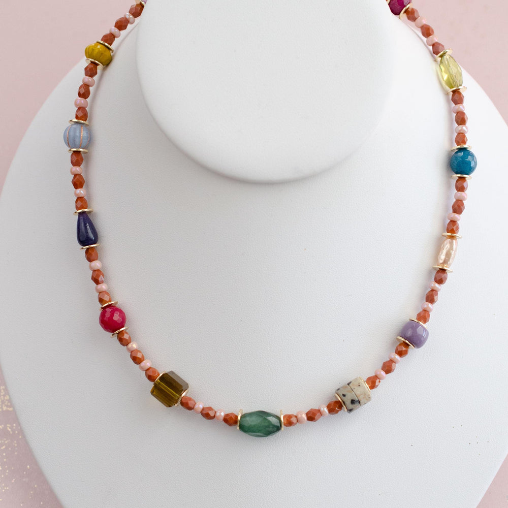 Handmade colorful beaded necklace featuring a mix of brown and pink seed beads with Czech glass and gemstone accent beads. Easy to wear on its own or layered with other necklaces.