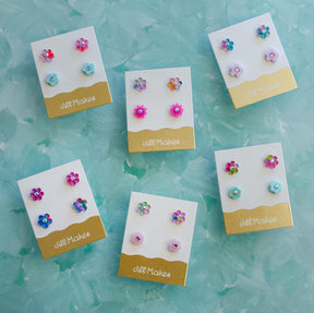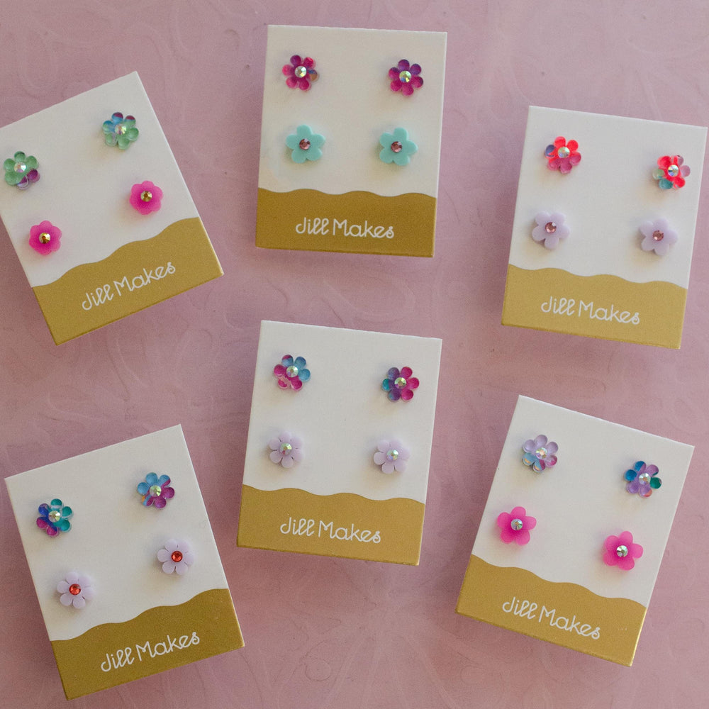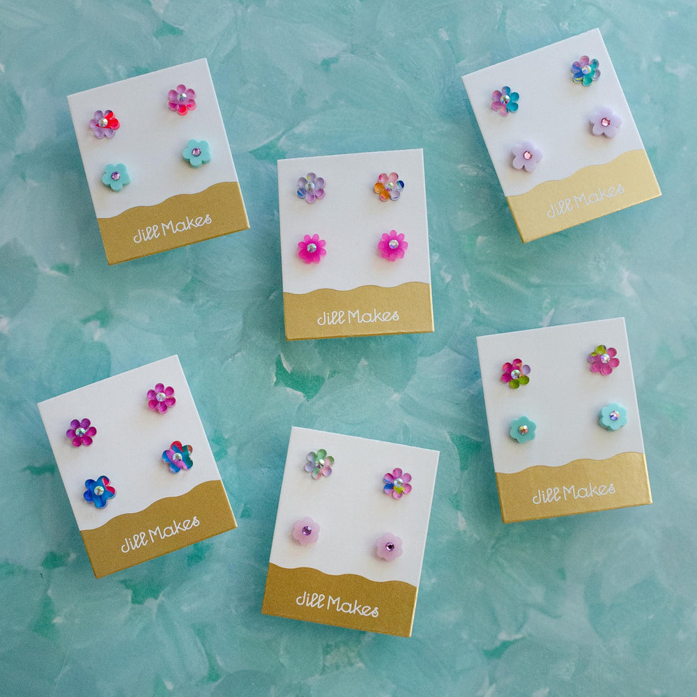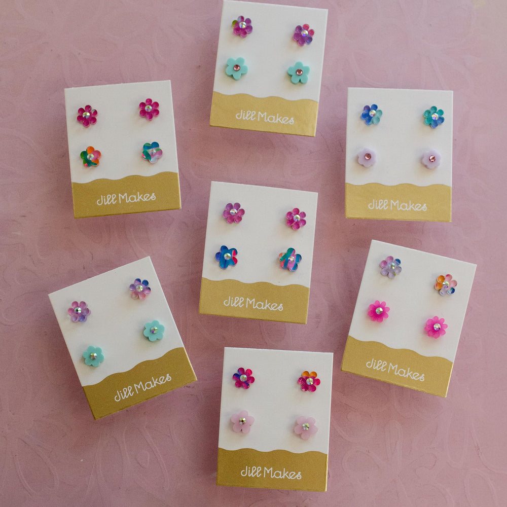 Each pair of flower earrings is made from leftover acrylic from our other earring designs. The colors and patterns vary depending on what materials are left in the studio, so every set is unique and different. Each tiny flower features a small rhinestone in the center.